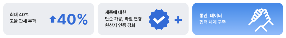 미국은 2025년부터 베트남을 통한 중국산 제품의 ‘공급망 경유’에 대해 🔷 최대 40%의 고율 관세 부과, 🔷 단순 가공·라벨 변경 제품에 대한 원산지 인증 강화, 🔷 베트남 정부와의 통관·데이터 협력 체계 구축 등을 추진하고 있습니다.